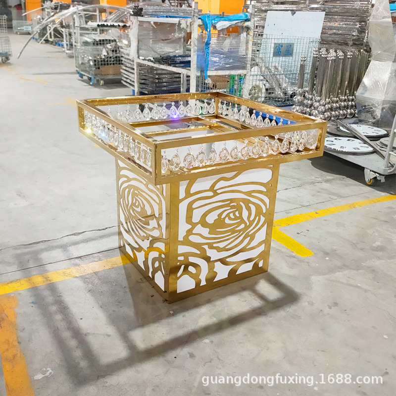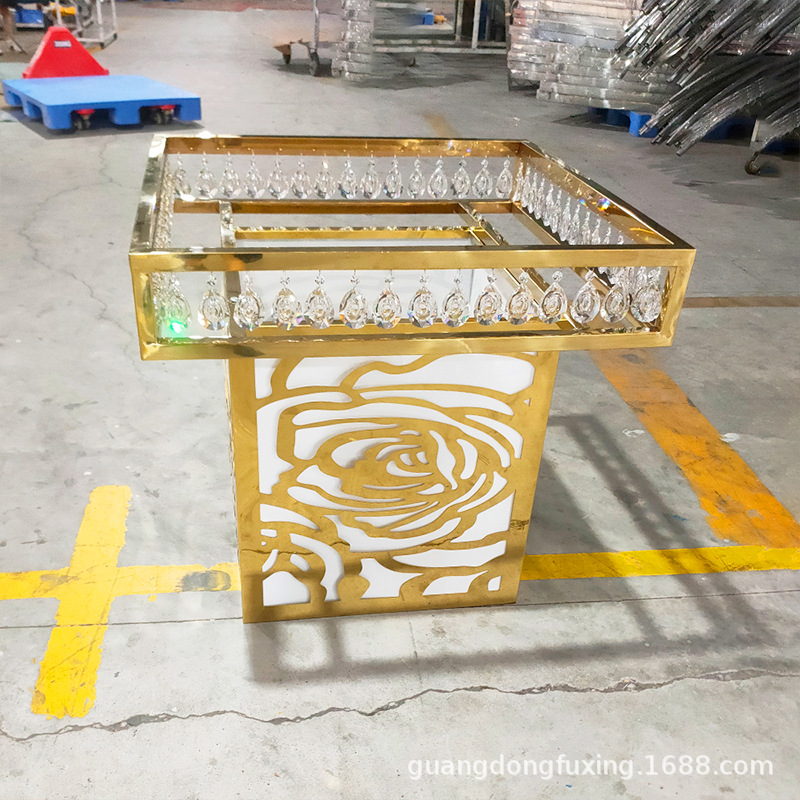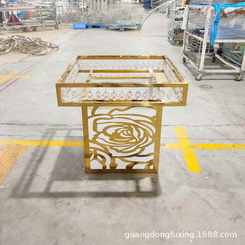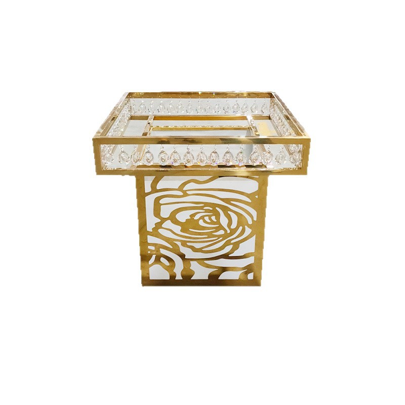 Latest Design Gold Stainless Steel Frame Glass Top Cake Display Table with Crystal for Wedding Decorate