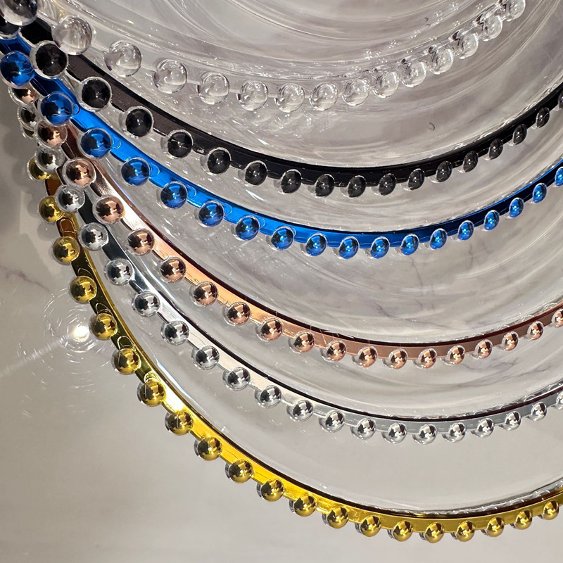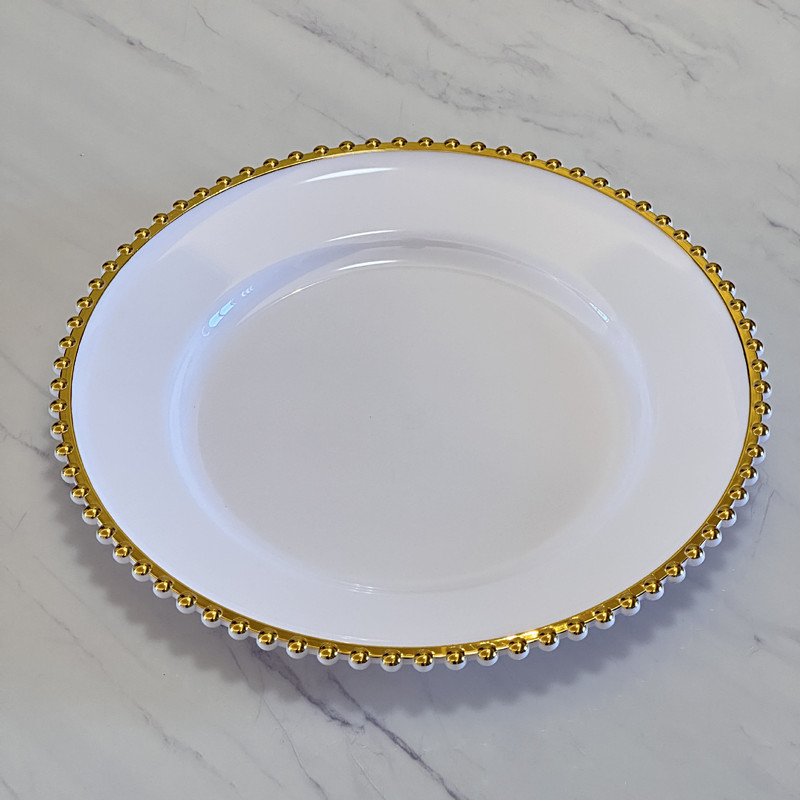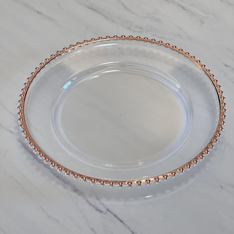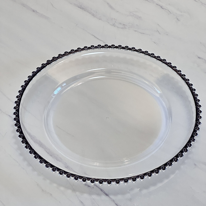 | Product Name | Wedding Decoration 13 Inch Round Clear Gold Rim Plastic Charger Plate With Gold Silver Black Beads |
